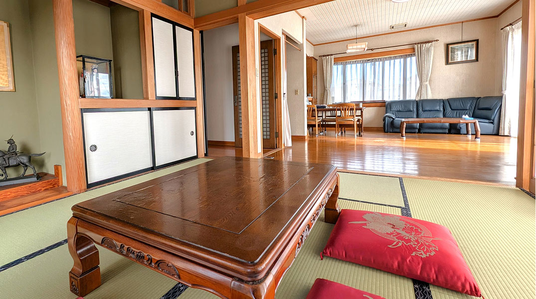 田んぼに囲まれたのどかな平家建ての一軒家。1日1組限定です。定員5名なので、ご家族やグループでのご利用にお薦めです。障子や畳といった日本建築の美に包まれたお部屋で、のんびりお過ごしください。